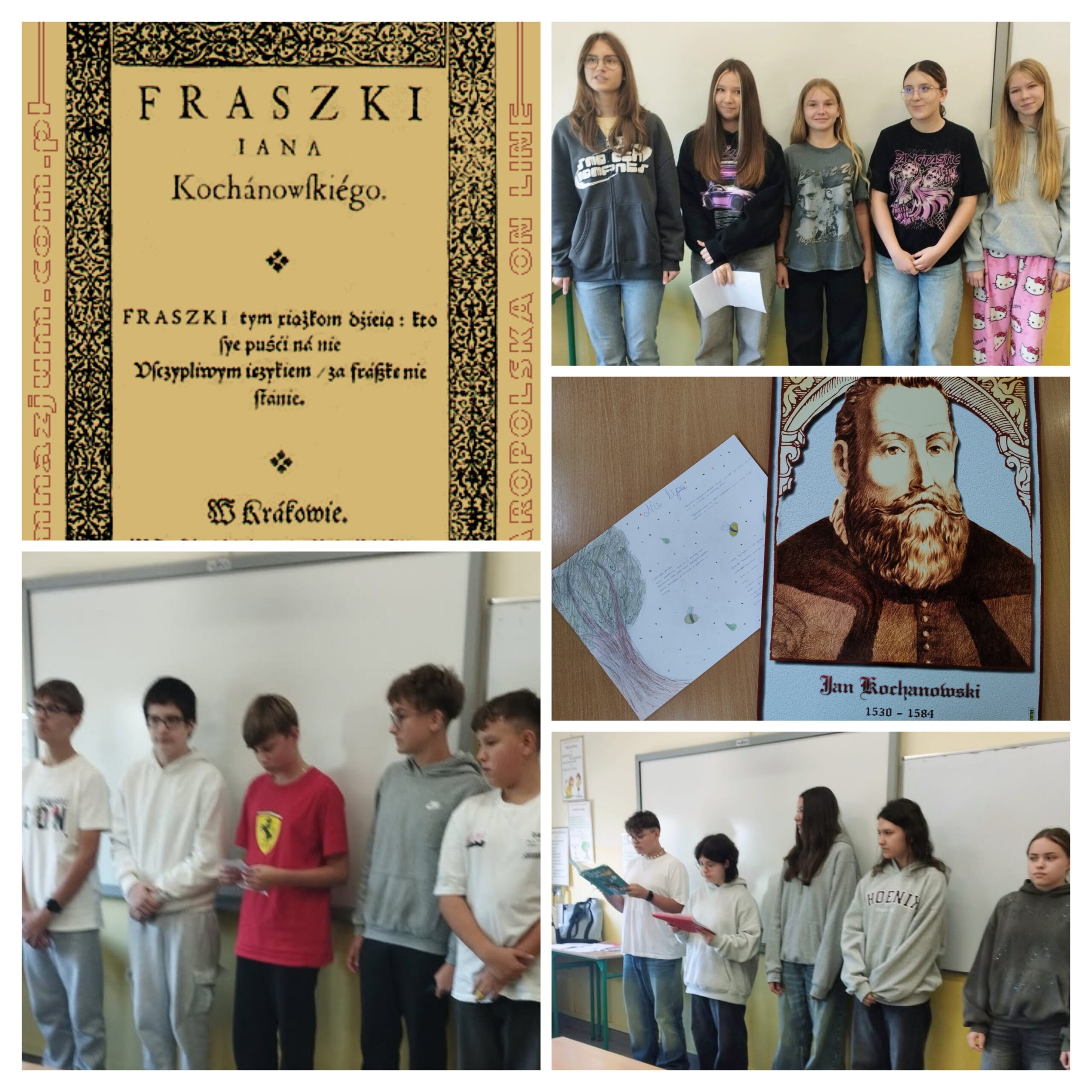 Uczniowie klasy ósmych realizowali projekt, którego celem było poznanie bogatej twórczości fraszkopisarskiej Jana Kochanowskiego. Sięgnęli po zbiór ponad 300 różnorodnych utworów, będący panoramą życia szlacheckiego XVI wieku; łączące dowcip, epikureizm i refleksję filozoficzną, obejmujące tematykę obyczajową, miłosną, autobiograficzną i patriotyczną. Kochanowski, wprowadzając termin „fraszka” (z wł. frasca – gałązka, drobiazg) do polszczyzny, pokazał, że krótka forma może opisywać zarówno błahostki, jak i głębokie prawdy o człowieku. Uczniowie w grupach mieli za zadanie stać się znawcami wylosowanej fraszki; wskazać wartości w niej ukazane. W ciekawej i ułatwiającej zapamiętanie formie wykonywali polecenia związane z utworem. Wyniki swojej pracy każda grupa zaprezentowała koleżankom i kolegom z klasy.
