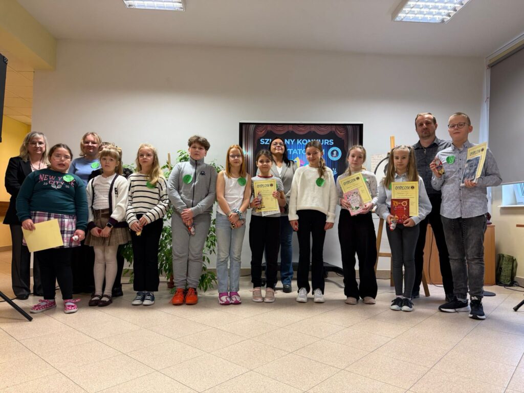 W poniedziałek 08.12.2025 roku w naszej szkole odbył się finał Szkolnego Konkursu Recytatorskiego dla klas IV–VIII. Celem konkursu było rozwijanie zainteresowań czytelniczych i recytatorskich, popularyzowanie poezji polskiej, doskonalenie sztuki recytatorskiej oraz umożliwienie uczniom zaprezentowania swoich zdolności i umiejętności. Do finału każda klasa, wspólnie z nauczycielem języka polskiego, zgłaszała dwóch reprezentantów. Warunkiem uczestnictwa w etapie szkolnym było przygotowanie przez uczniów recytacji utworu lub jego fragmentu i zaprezentowanie go na forum klasy. Dzieci z klas IV – VI miały do wyboru wiersze Marii Konopnickiej, Danuty Wawiłow i Joanny Kulmowej. Uczniowie klas VII – VIII wybierali wiersze Antoniego Słonimskiego lub Marii Pawlikowskiej – Jasnorzewskiej.