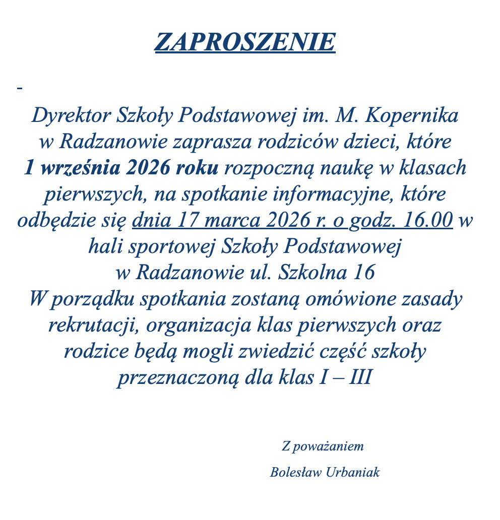 REKRUTACJA DO PIERWSZYCH KLAS SZKOŁY PODSTAWOWEJ NA ROK SZKOLNY 2026/27 ZGŁOSZENIE O PRZYJĘCIE DO SZKOŁY WNIOSEK O PRZYJĘCIE DO SZKOŁY REGULAMIN REKRUTACJI DZIECI DO KLAS PIERWSZYCH ZARZĄDZENIE WÓJTA Plan sieci publicznych szkół podstawowych – Gmina Radzanowo PODSTAWOWE DOKUMENTY SZKOLNE Statut Szkoły wraz z Wewnątrzszkolnym Ocenianiem UCHWAŁA Rady Pedagogicznejz dnia 30.08.2023 roku Statut Szkoły wraz z Wewnątrzszkolnym Ocenianiem UCHWAŁA Rady Pedagogicznej Szkoły Podstawowej im. Mikołaja Kopernika w Radzanowie z dnia 06.02.2024 roku w sprawie zmian w Statucie Szkoły UCHWAŁA Rady Pedagogicznej Szkoły Podstawowej im. Mikołaja Kopernika w Radzanowie z dnia 29.08.2024 roku Procedury bezpieczeństwa i postepowania w sytuacjach kryzysowych Wniosek o stypendium naukowe 2025/26 HALA SPORTOWA Umowa wynajmu Regulamin hali sportowej Uchwała nr XII 70 2019 Klauzula informacyjna dla korzystającego z infrastruktury Zgoda rodzica – dzieci i młodzież do lat 18 – hala sportowa Karnet na siłownię/salę aerobową Wymagania edukacyjne Język polski PO Plastyka Historia/WOS PO Informatyka PO Technika Edukacja wczesnoszkolna PO Biologia PO Przyroda Chemia/Fizyka PO języki obce EDB Muzyka Matematyka Religia Wychowanie fizyczne Geografia DOKUMENTY DLA RODZICÓW Standardy Ochrony Małoletnich w SP im. Mikołaja Kopernika w Radzanowie Regulamin wycieczek szkolnych Regulamin dowożenia dziecka do szkoły Wniosek o przyjęcie dziecka do klasy IV sportowe Procedura wydania legitymacji szkolnej Wniosek o wydanie nowej legitymacji szkolnej Wniosek o wydanie duplikatu legitymacji szkolnej Wniosek o wydanie duplikatu świadectwa szkolnego Wniosek o wydanie duplikatu karty rowerowej Umowa – obiady luty 2026 DOKUMENTY DLA NAUCZYCIELA Standardy ochrony małoletnich